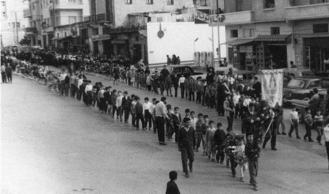 Front of the funeral procession of Khoury Hanna Dib Grandchild Raymond carrying the cross at the head of the procession